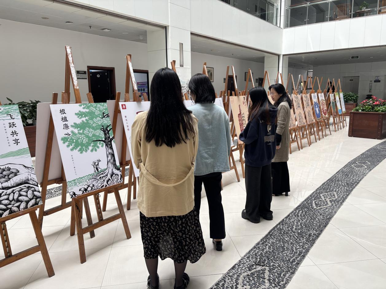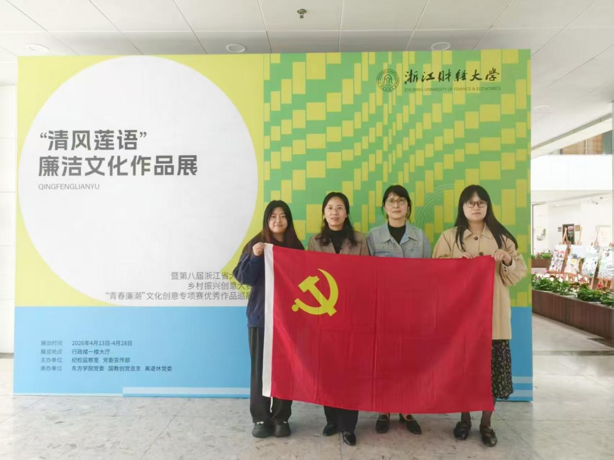 展览现场,支部党员驻足细观、交流感悟。本次展览以“赓续廉洁文脉、涵养崇廉风尚”为核心集中呈现离退休老干部书画作品与青年学子廉洁文创佳作,实现银发风骨与青春创意的跨时空对话,生动诠释“进德修业、与时偕行”的校训精神与浙财清廉文化内涵。